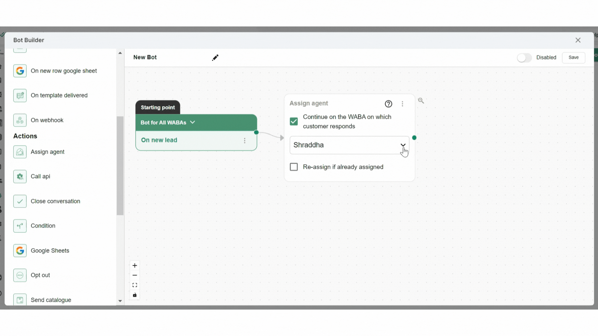 * **Automatic Assignment:** The chatbot triggers the "**Assign Agent**" action, randomly assigning the inquiry to an available agent or directing it to a designated expert based on predefined criteria.