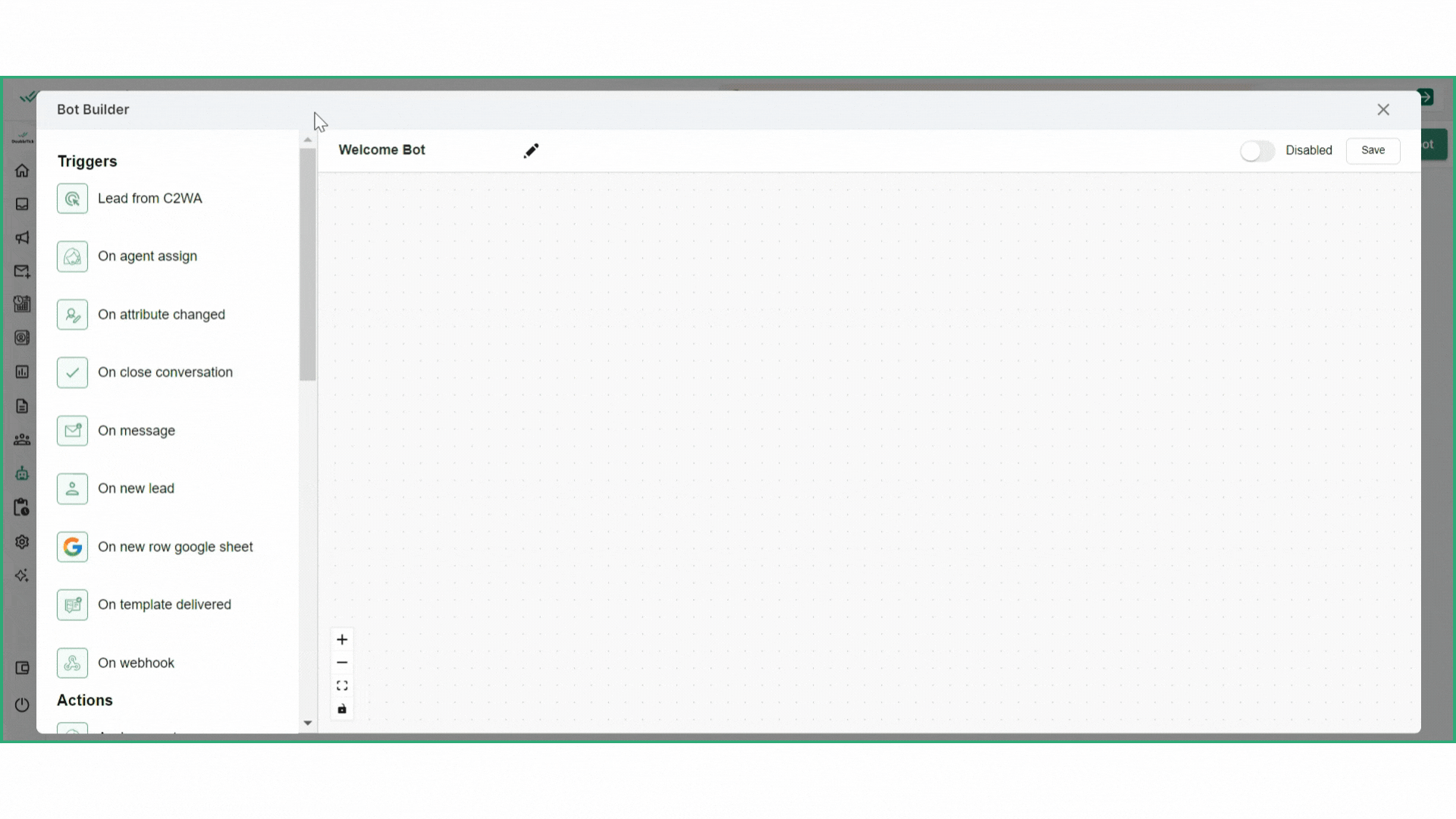 The side panel consists of triggers and actions; triggers are the starting point that initiate bot responses, while actions determine what the bot does in response to those triggers.