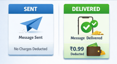 * **Delivered** – Once the template is successfully delivered to the customer, the applicable template charge (for example, ₹0.99 for a marketing template in India) is deducted from your wallet.