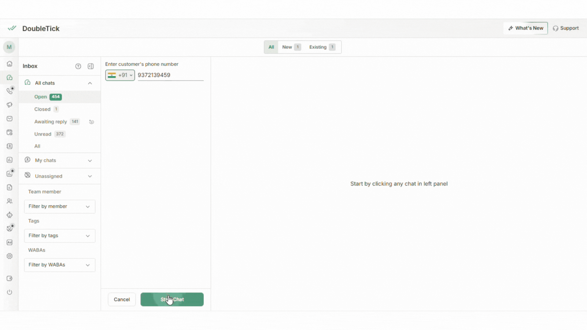 Using the **New Chat** option in the Chats section, you can quickly start a conversation with any customer by entering their phone number, selecting the appropriate WhatsApp API number, and sending a template message if required. Charges for template messages are applied only after the message is delivered, and once the customer replies, a 24-hour conversation window opens for regular messaging.