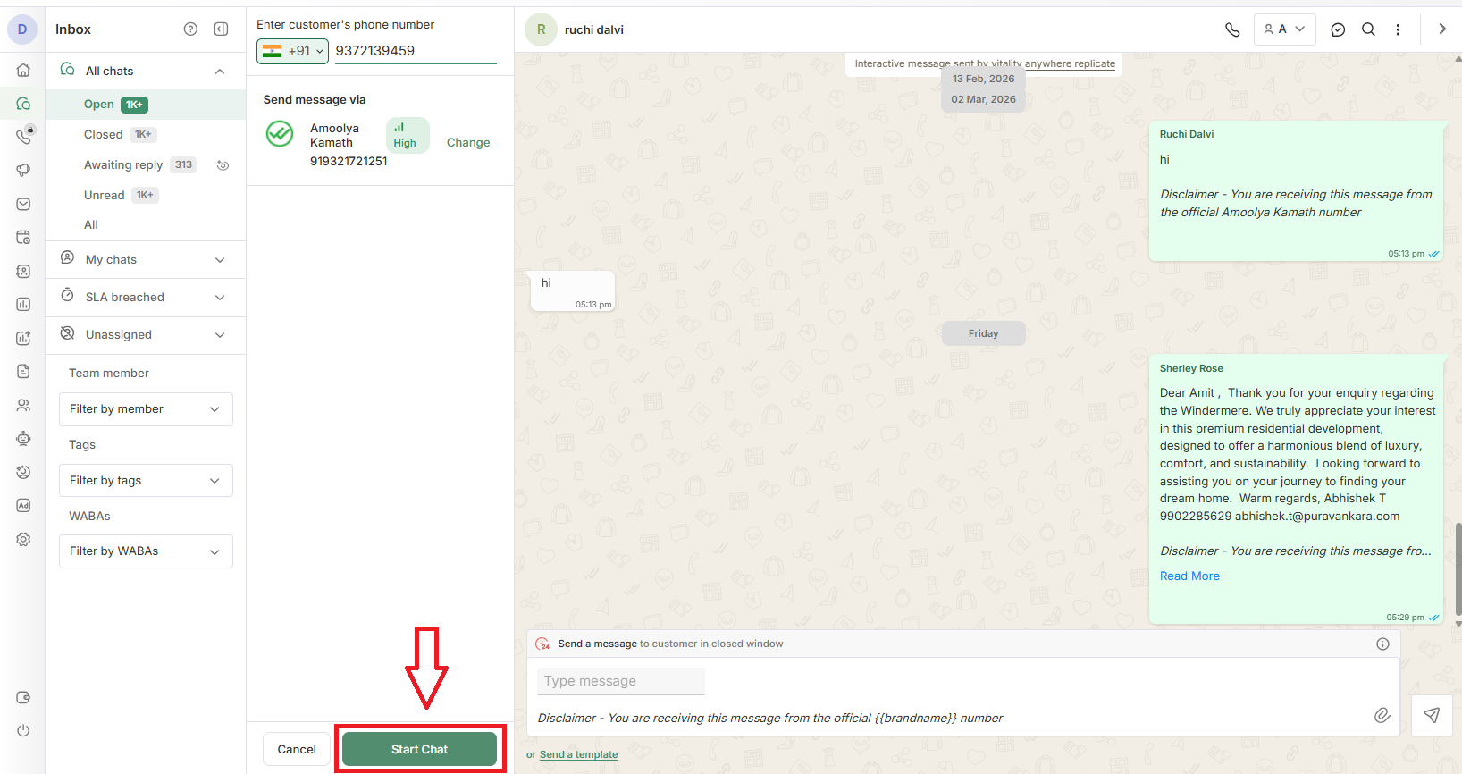 If the **24-hour conversation window is closed**, you will need to send a **WhatsApp template message** to initiate the conversation.