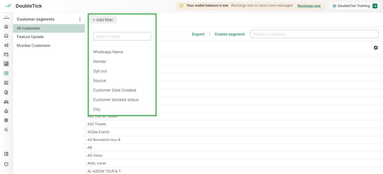 * When you click on "**Add Filter**," you'll encounter a dropdown menu containing all available **customer attributes**. This allows you to select the attribute you wish to filter by