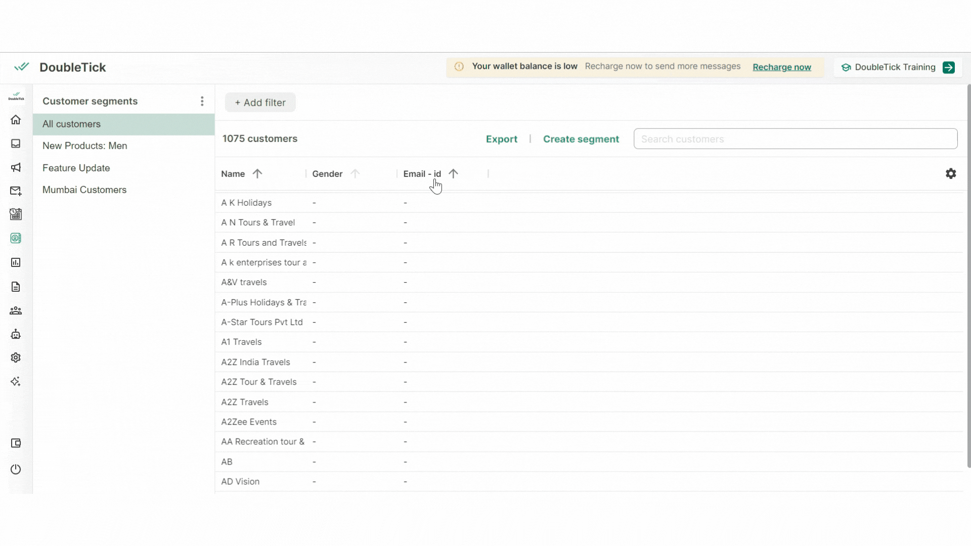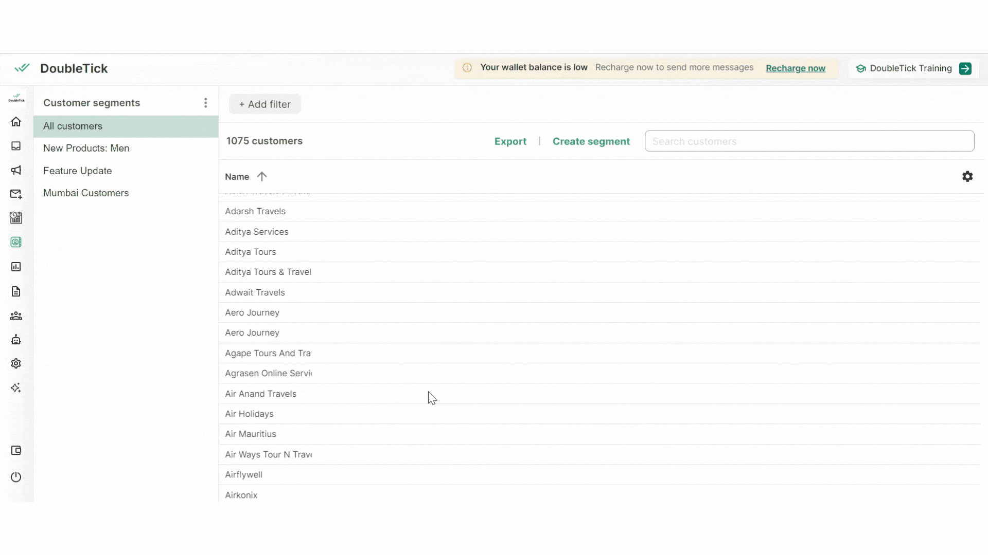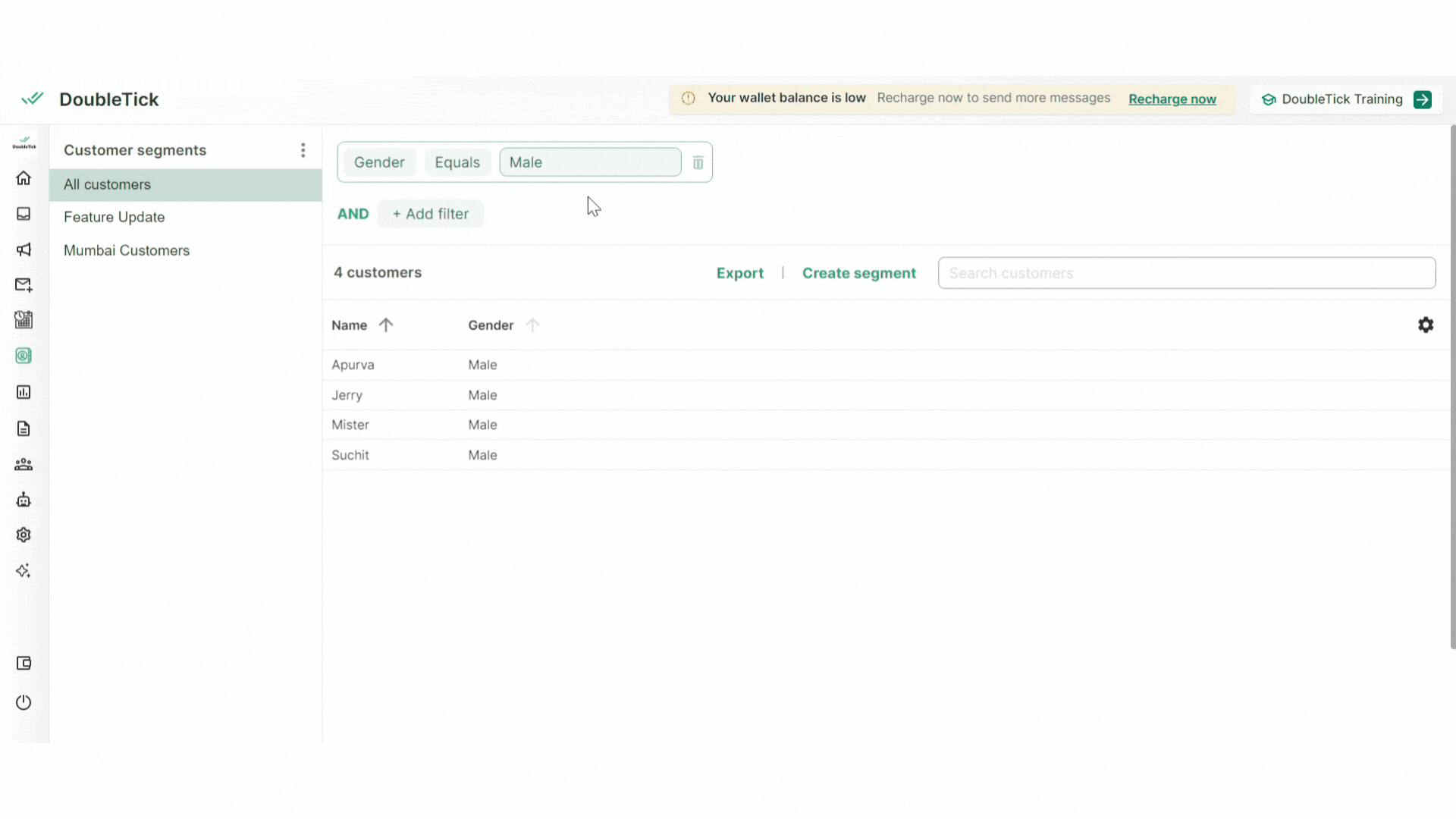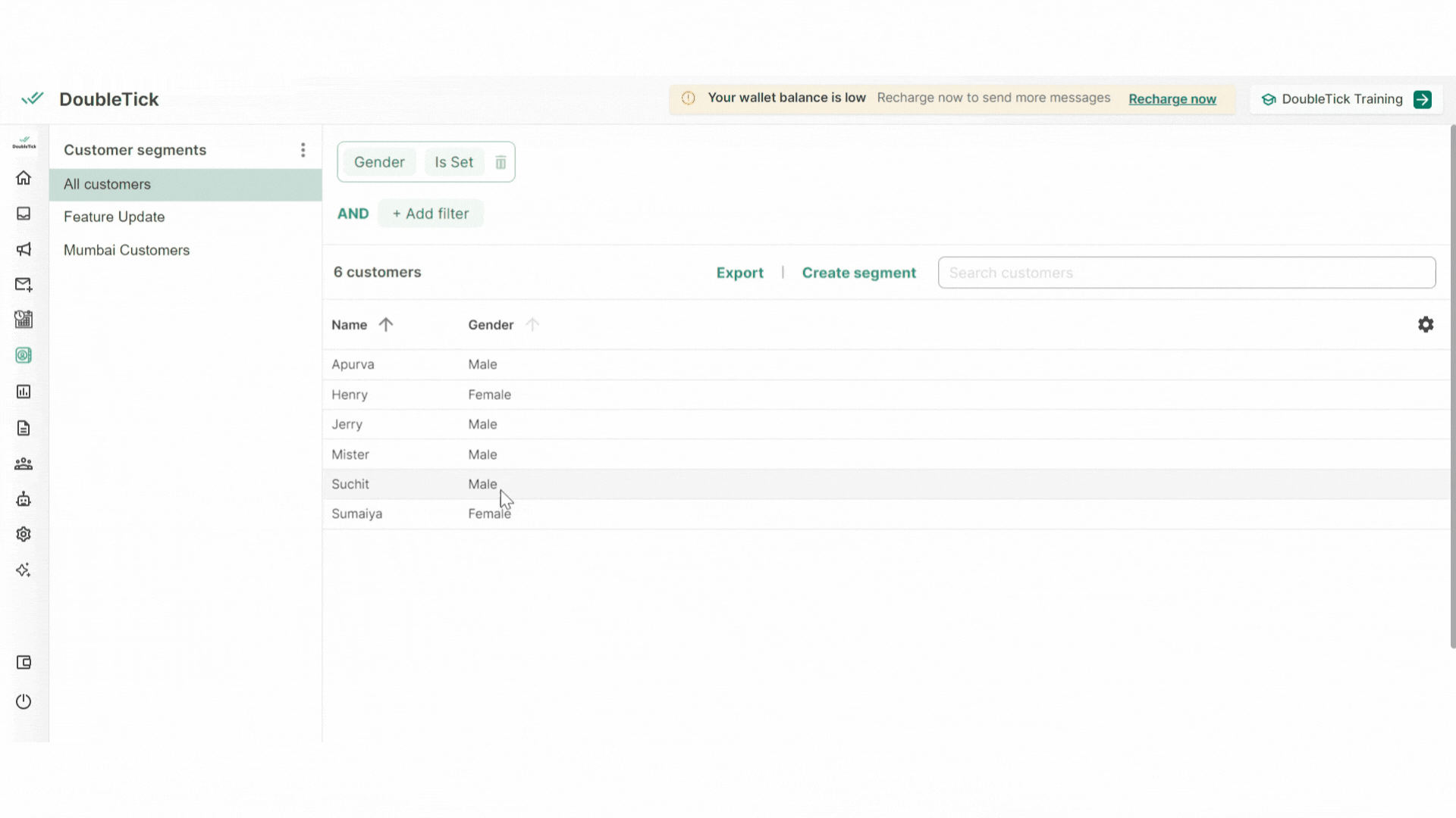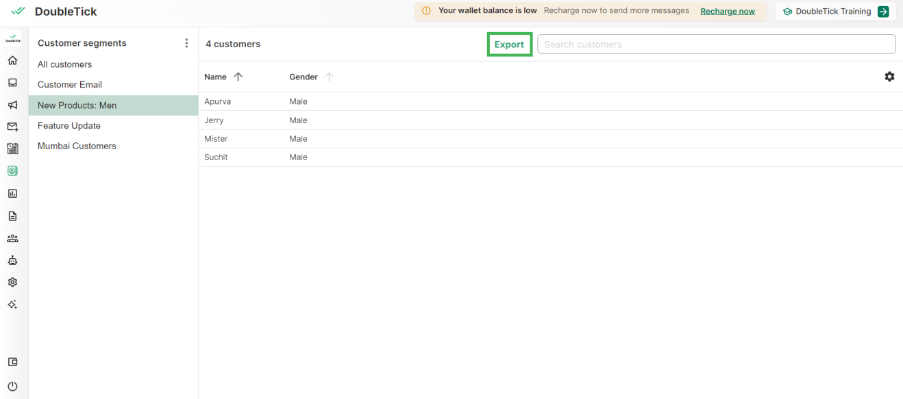 * To export customer details, simply click on the "<mark style="color:green;">**Export**</mark>" button.&#x20;