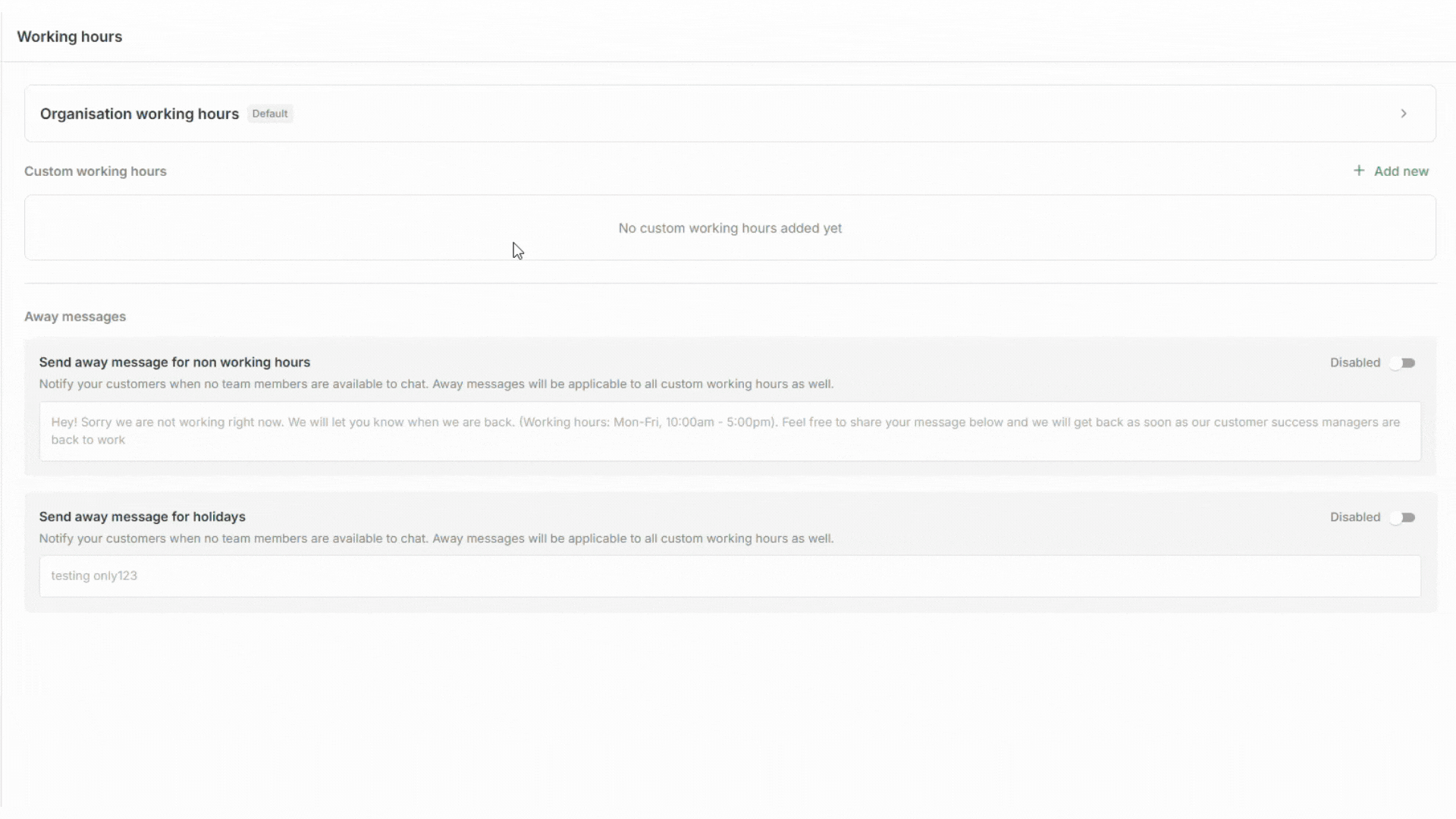Just as you set up holidays in your working hours configuration, you can also set a dedicated away message for those holidays. **Toggle the holiday away message option to enable it, update the message text if needed, and save.** This ensures customers are informed even on days when your team is not working at all.