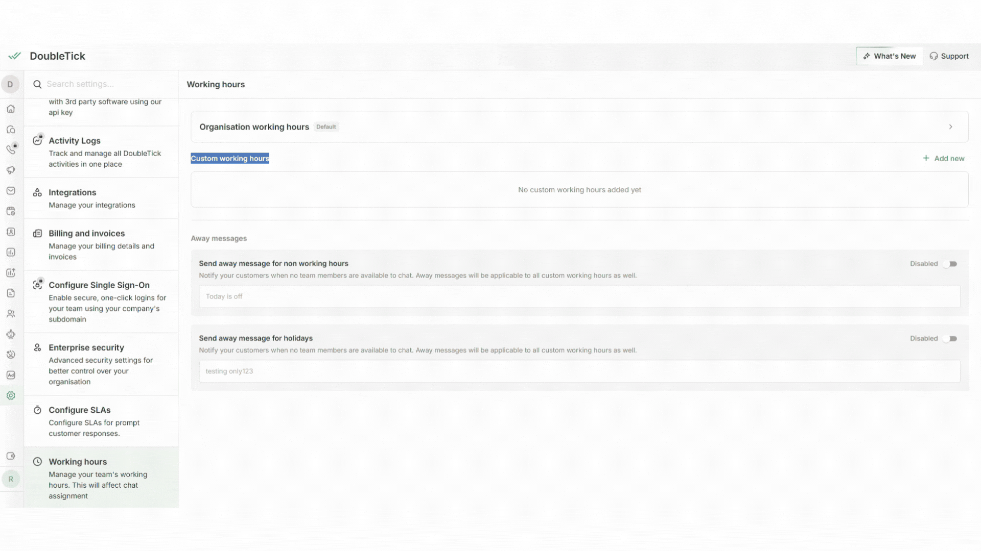 Use Organization Working Hours if your entire team works the same schedule. Use Custom Working Hours if different teams operate on different schedules or across different regions. In either case, DoubleTick will use these configurations to determine how bots behave and when chats are auto-assigned. Away messages take care of customer communication during the hours your team is unavailable.