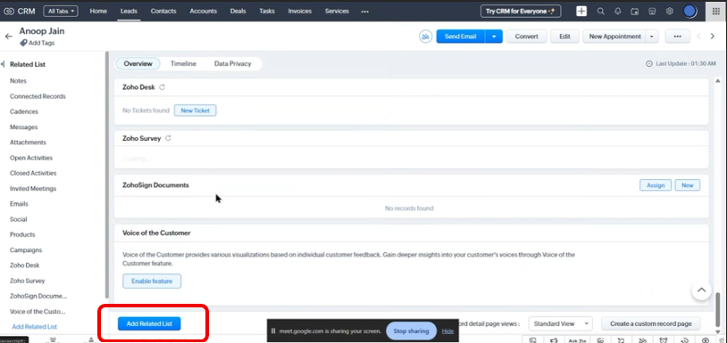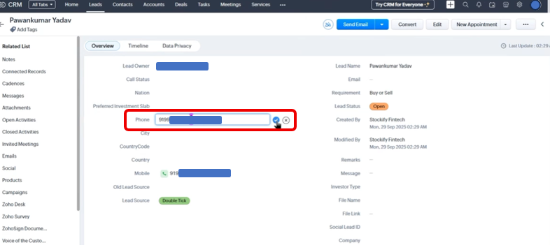 • Open any Lead inside Zoho CRM\
